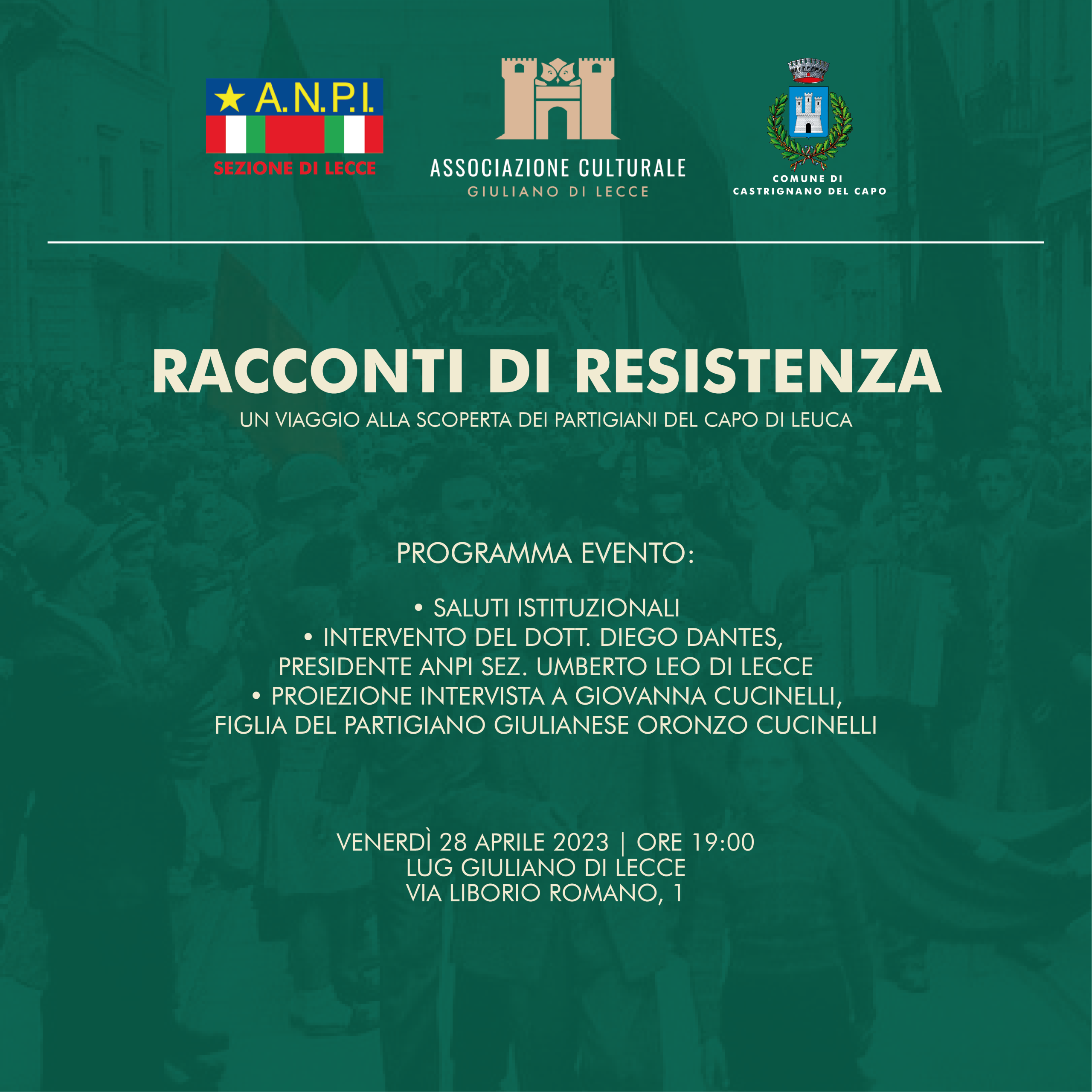 Anche alcuni cittadini giulianesi decisero di imbracciare le armi. Tra di essi c’era Oronzo Cucinelli, partigiano che combattè in Piemonte, la cui storia ci è stata raccontata dalla figlia Giovanna in un’intervista che abbiamo realizzato nei giorni scorsi e che proietteremo Venerdì 28 Aprile durante l’evento “Racconti di Resistenza” che si terrà al LUG di Giuliano, a partire dalle 19:00, e patrocinato dal Comune di Castrignano del Capo. Durante l’evento interverrà anche il Dott. Diego Dantes, presidente della sezione Umberto Leo dell’ANPI di Lecce.